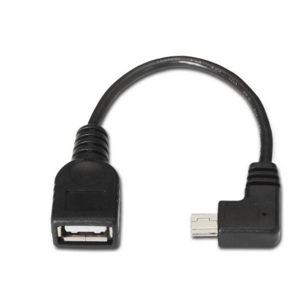 - Cable USB 2.0 OTG con conector acodado tipo Mini USB B macho en un extremo y tipo USB A hembra en el otro