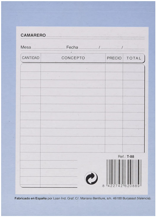Talonario CAMAREROS - Loan T-88 Duplicado Autocopiante