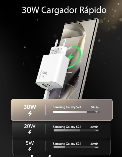 Descripción Cargador rápido de dos puertos, uno tipo USB-A y otro tipo USB-C. Con una potencia de 30W. El de tipo C es siempre de carga rápida, mientras el de tipo A, si lo conectas da carga rápida, pero si pones los dos al mismo tiempo baja a carga normal, que no se recupera hasta que desconectas de la red el cargador . Con las dos salidas se ahorras en enchufes. Con protección anti cortos y sobretensiones. Incluye cable de 2 metros de tipo C a tipo C. Funciona muy bien con los Samsung. Productos en la misma categoría