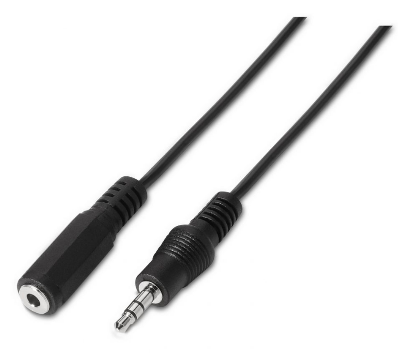 Cable audio estéreo con conector tipo Jack 3.5” macho en un extremo y tipo Jack 3.5” hembra en el otro.