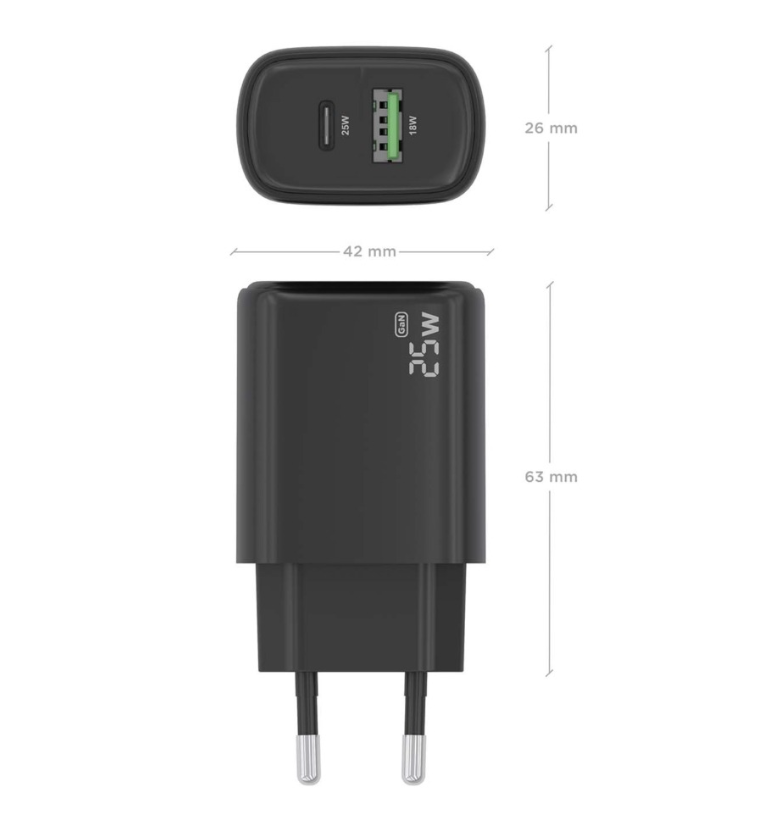 > Cargador USB-C 25W para cargar portátiles, móviles, cámaras y tablets etc. Diseño muy elegante, moderno y práctico.