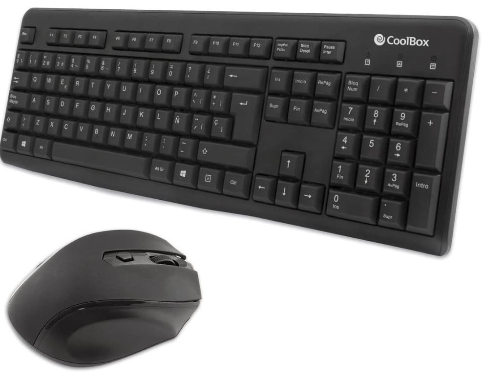 CoolBox COO-KTR-02W - Pack Teclado y Ratón Inalámbrico 2.4GHz con Diseño Ergonómico y Silencioso. Teclado Español con 105 Teclas y Bloque Numérico, Ratón Ambidiestro 1600DPI Ajustable. Negro
