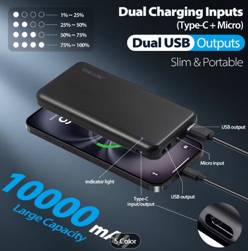 ENEGON Batería Portátil de 10000mAh con Carga Rápida - 22.5W PD Carga Rápida, Pantalla LED de Batería + Entrada USB-C/USB-A, Batería Externa Ultra Delgada para iPhone 17/16/15/14, Android, Samsung, Tabletas, Emergencias de Viaje y Exteriores